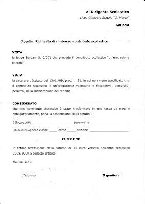 In una circolare del 13/01/09, prot. n. 91, firmata dal Dirigente scolastico, Orazio Greco, si legge che il contributo “dovrà essere pagato da tutti” e che “per il contributo non è previsto alcun esonero” per le famiglie disagiate.
